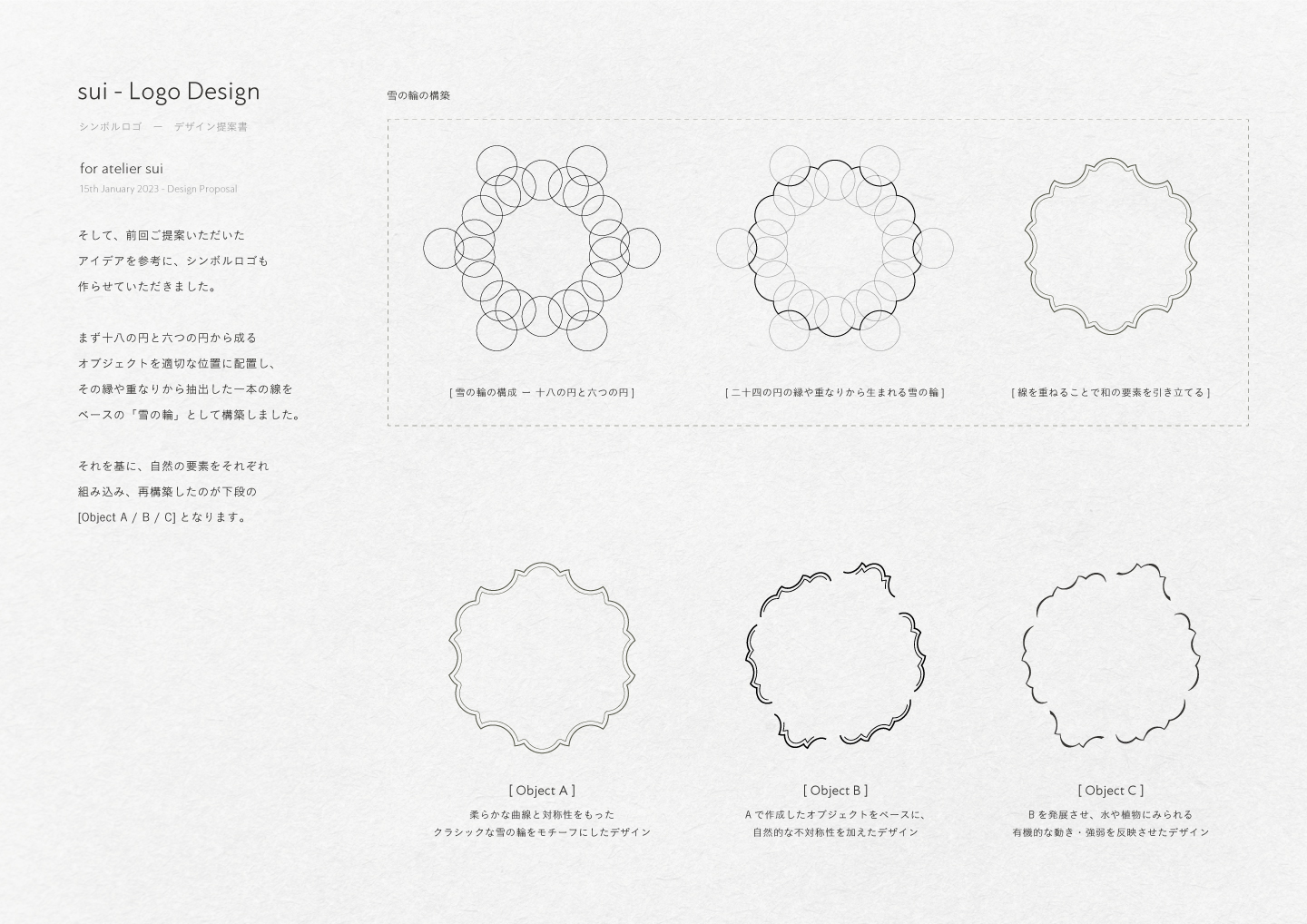 シンボルロゴは、二十四節気に掛け、十八と六つの正円から成る雪の輪を基としたオブジェクトを、24°傾け、有機的な非対称性を持たせています。