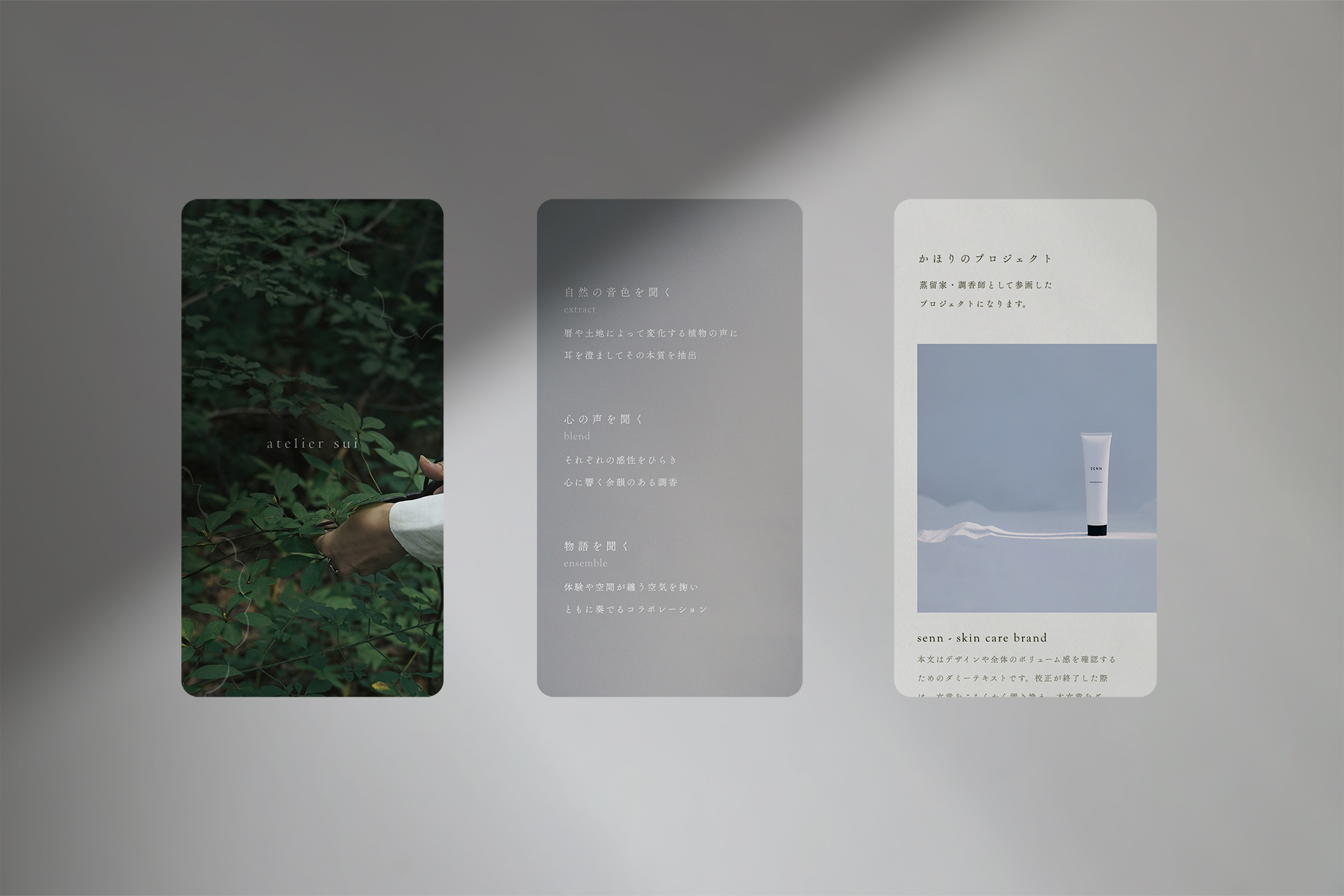 昨年の夏、蒸留家・調香師である沙里さんとの打ち合わせを兼ね軽井沢のラボへ訪れた際、彼女と対峙し、対話をし、香りを重ねていただきました。そこでの言葉を超えた繋がりや感じた温かみ、自然の雄大さに心が震えたのをよく覚えています。そんな心の繊細な靡きを視覚表現として解釈し、ロゴデザインやグラフィック、デジタルデザインの設計をさせていただきました。